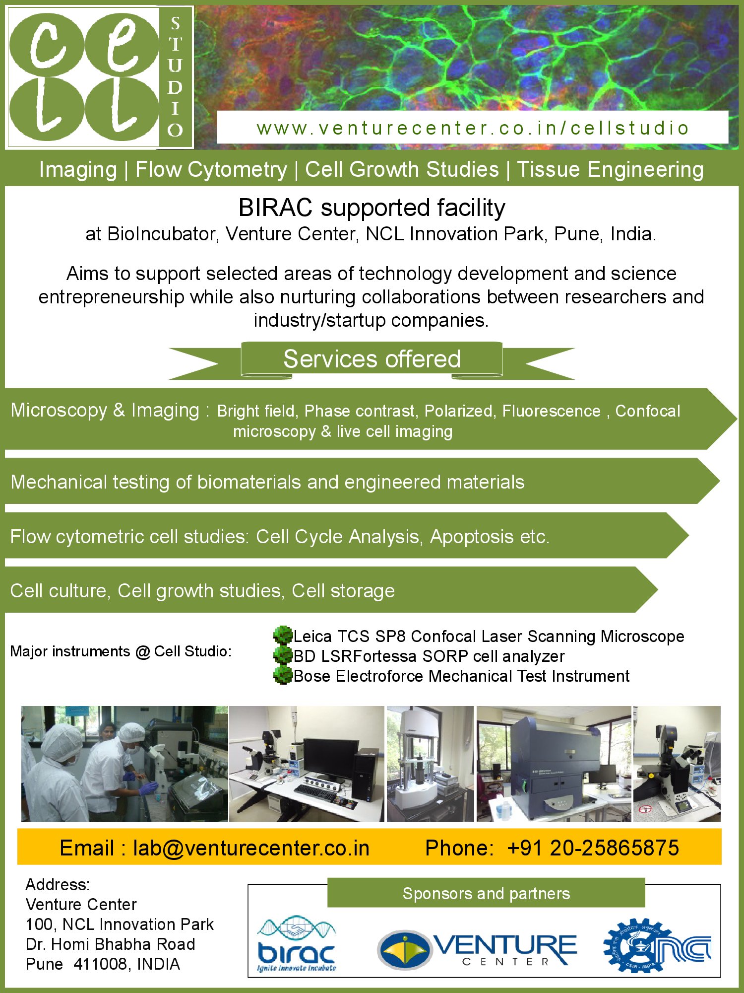 Cell Studio is a facility of the BIRAC supported BioIncubator at Venture Center, NCL Innovation Park, Pune, India. The Cell Studio is home to advanced scientific facilities for microscopy and imaging, flow cytometry, cell growth studies and tissue engineering. The Cell Studio aims to support selected areas of technology development and science entrepreneurship while also nurturing collaborations between researchers and industry/startup companies. The facility is open to all. Cell Studio launch date: 1 Sep 2014.