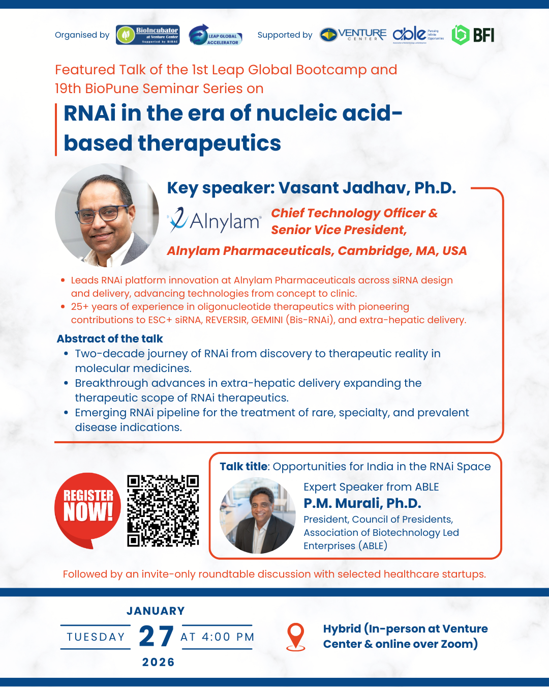 The talk takes a forward-looking view of the RNAi landscape and the emerging opportunities for India in this space, framed by advances in nucleic acid therapeutics and a strengthening biotech ecosystem. It highlights how innovation pathways, talent, infrastructure, and policy enablers could shape India’s positioning as the field matures globally and new applications move closer to clinical and commercial reality.