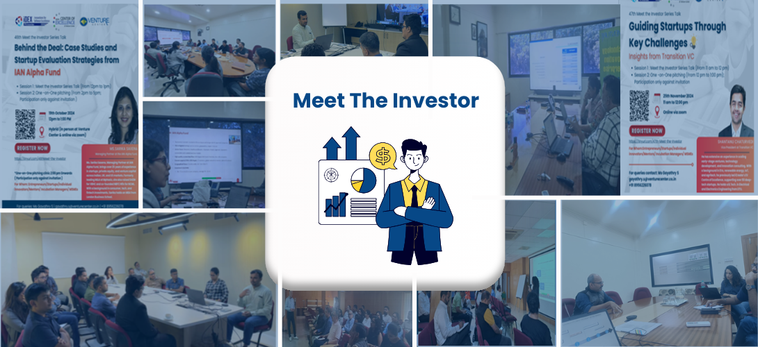 The Meet the Investor Series is Venture Center’s flagship initiative designed to connect our vibrant community of deep-tech and science-led startups with the investor ecosystem. The series features insightful talks by seasoned investors who share their journey, investment thesis, market insights, and fund philosophy, case studies while interacting directly with early-stage entrepreneurs.